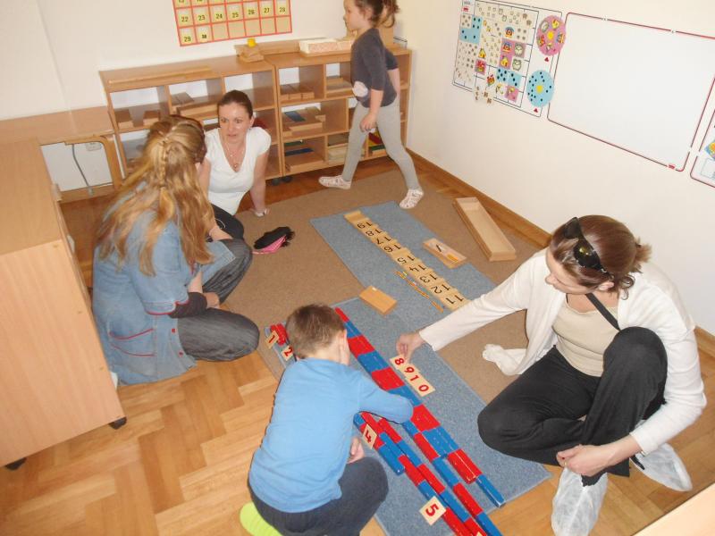 Za svako područje rada (praktični život, senzoričko područje, područje jezika, matematiku, kozmički odgoj) koristimo pripadajući Montessori pribor, a svakom djetetu se pristupa individualno.